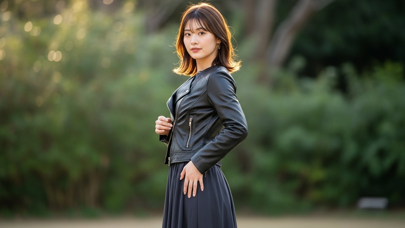 ロング丈のレザージャケットに挑戦したい場合は、Iラインシルエット+ヒールのある靴で調整するとバランスが取りやすくなりますよ。