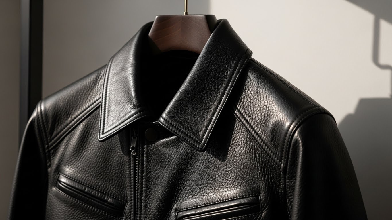 ノーカラーのシンプルなレザージャケット(腰丈・ブラウンまたはブラック)