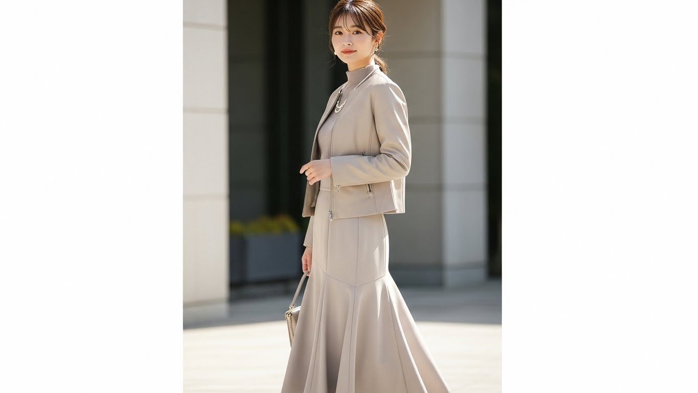 黒よりもベージュ、グレージュ、キャメルなどを選ぶと、重たくならず軽やかな印象に!