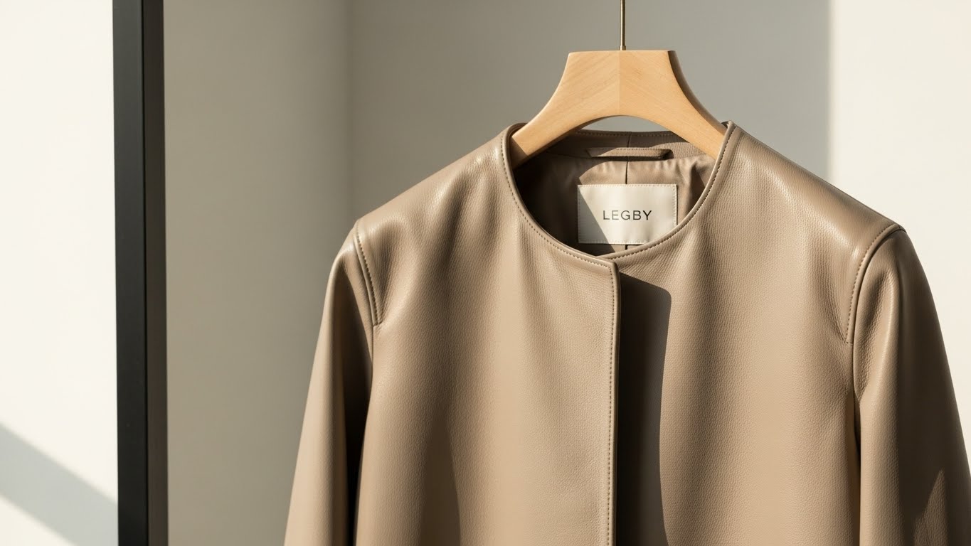 (アイテム挿入箇所:アイボリー系・ノーカラー・柔らかいラムレザー素材)