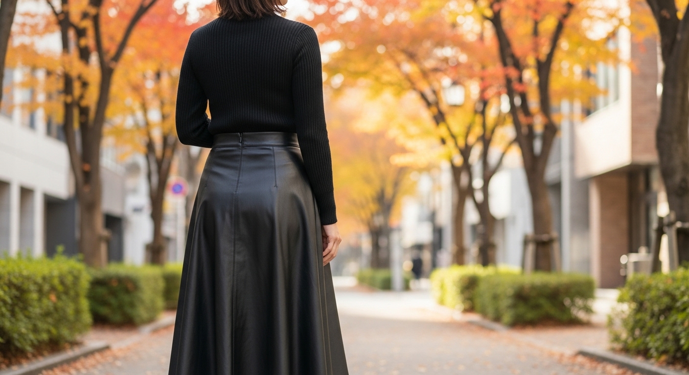 レザースカートは丈やシルエットで印象が大きく変わります。