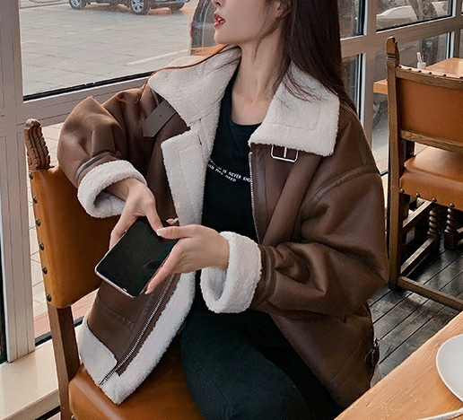 暖かいボア裏地が特徴的なレザーファッションアウターです。 大きな襟とベルトディテールが魅力のレザージャケットで、防寒性と高級感を両立しています。 カジュアルにもきれいめにも合わせやすい万能なレザーアウターです。
